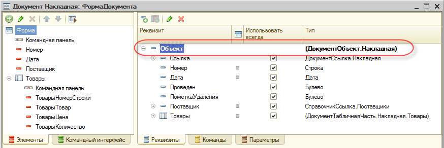 В этой функции сначала мы преобразуем данные реквизита формы Объект в прикладной объект типа ДокументОбъект.Накладная.