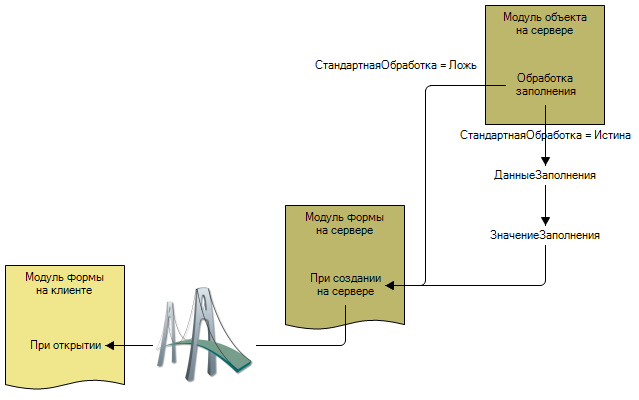 Для простоты предположим, что у объекта всего один реквизит, подлежащий заполнению. Тогда платформа будет действовать по следующему алгоритму: