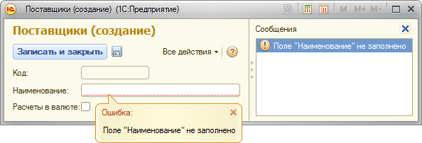 Здесь в свойстве Поле указывается имя реквизита формы. В результате выведенное сообщение будет привязано к тому элементу формы, который связан с этим реквизитом формы: