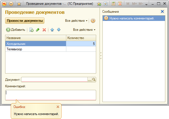 Аналогичным образом можно привязать сообщение и к любой ячейке таблицы, расположенной в форме. В этом случае кроме имени реквизита, содержащего таблицу, необходимо будет указать индекс нужной строки в таблице и имя колонки таблицы. Например, так: