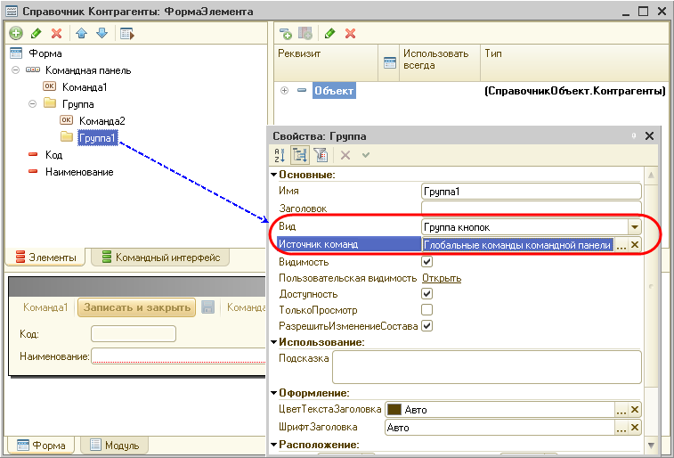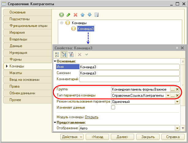 Например, у объекта конфигурации справочник Контрагенты существует команда Команда3. Эта команда имеет группу размещения команд - Командная панель формы.Важное и тип параметра команды - СправочникСсылка.Контрагенты.