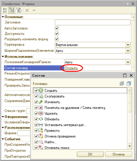 Для этого нужно открыть окно Состав команд в палитре свойств формы.