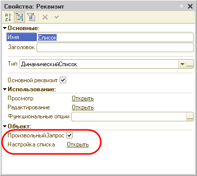 Затем создадим форму списка документов ПриходнаяНакладная и создадим реквизит формы ФильтрПоТовару, который мы будем использовать в качестве параметра формы при ее открытии. Теперь откроем палитру свойств основного реквизита формы Список. Установим флаг ПроизвольныйЗапрос и в строке Настройка списка нажмем Открыть.