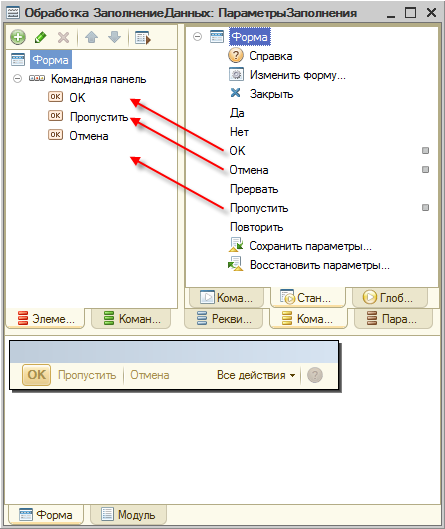 В командную панель этой формы перенесем три стандартные команды: ОК, Пропустить, Отмена: