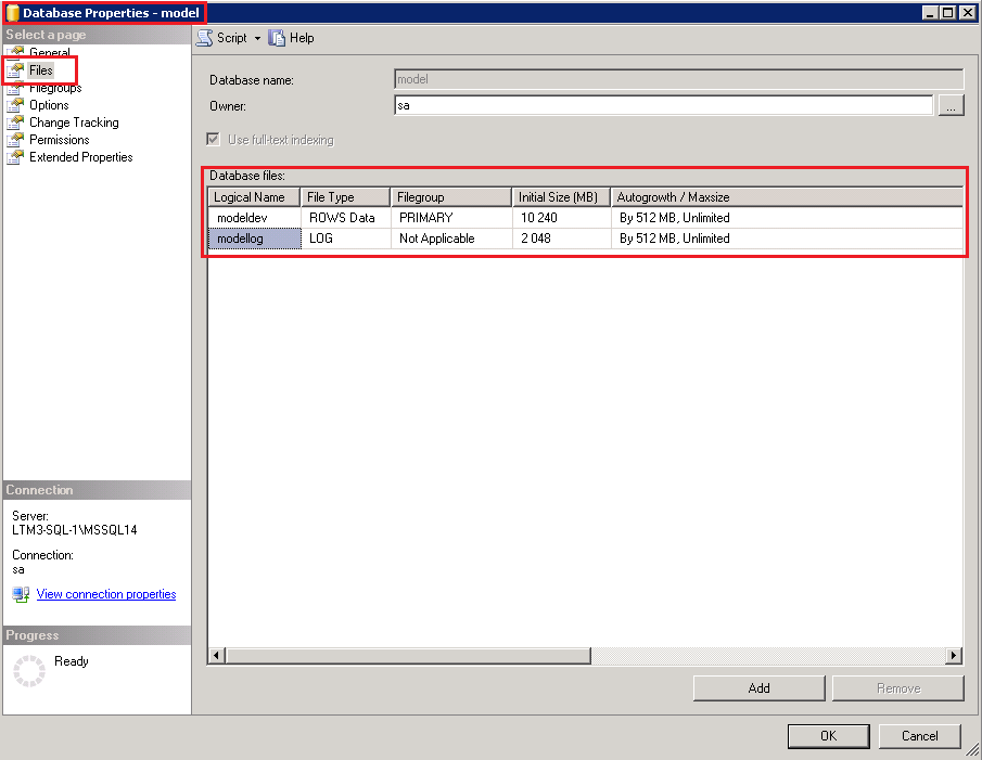 Параметры рабочей базы аналогичны параметрам базы model, за исключением начального размера файлов (Initial Size).