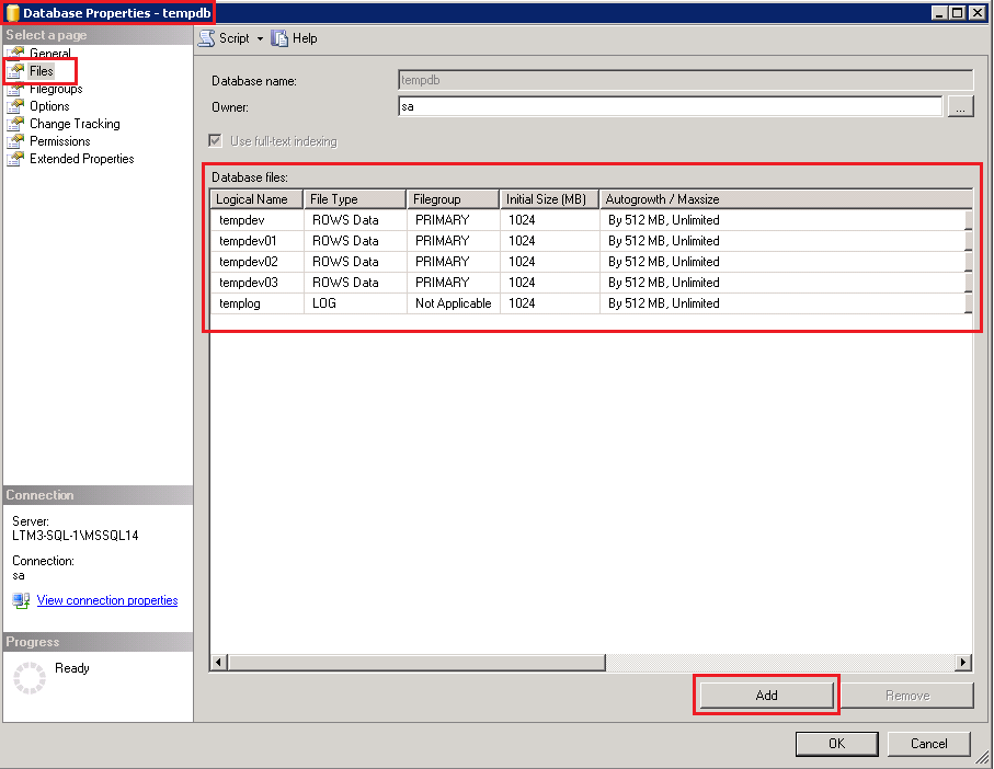 - если tempdb расположена на отдельном массиве (диске), то начальный размер файла данных (Initial size) установить равным (50% всего объема / Кол-во файлов).