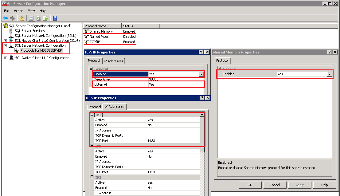 Если сервер 1С:Предприятия расположен вместе с Microsoft SQL Server - включить протокол Shared Memory.