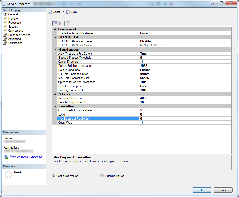 Одним из них является дополнительный параметр MS SQL Server Max degree of parallelism. Описание приведено в документации Microsoft https://technet.microsoft.com/ru-ru/library/ms181007(v=sql.105).aspx. Согласно нему, "параметр max degree of parallelism используется для ограничения числа процессоров, применяемых в планах параллельного выполнения. Чтобы разрешить серверу определять максимальную степень параллелизма, установите 0 в качестве значения данного параметра, то есть значение по умолчанию. Чтобы отключить создание параллельных планов, присвойте параметру max degree of parallelism значение 1.Параметр максимального значения степени параллелизма определяется выпуском SQL Server, типом ЦП и операционной системой. Если указано значение, превышающее количество доступных процессоров, используется фактическое число доступных процессоров. Если у компьютера только один процессор, то значение параметра max degree of parallelism учитываться не будет."