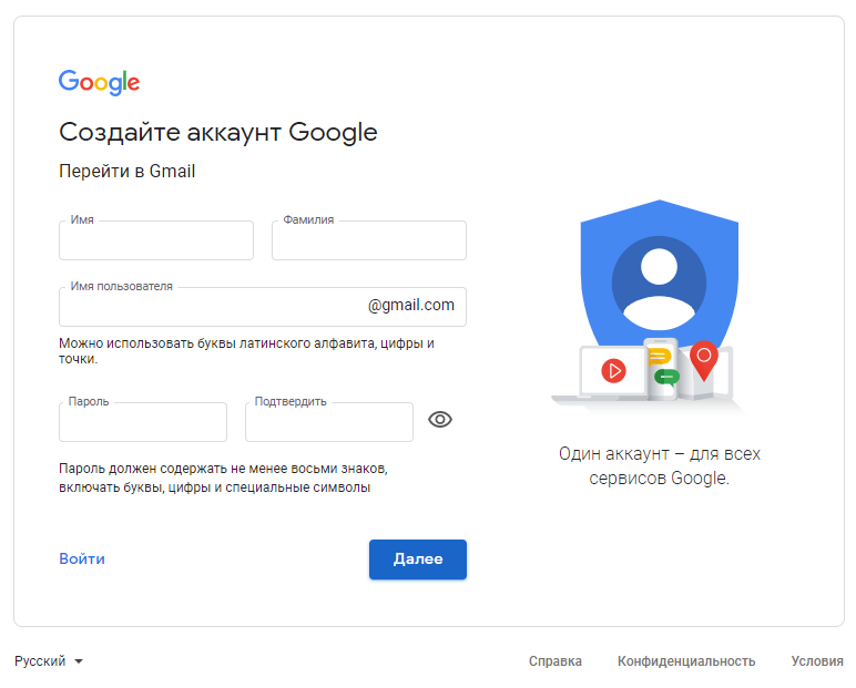 Для регистрации пользователя необходимо перейти по ссылке https://accounts.google.com/signup, заполнить все обязательные поля и нажать кнопку «Далее».