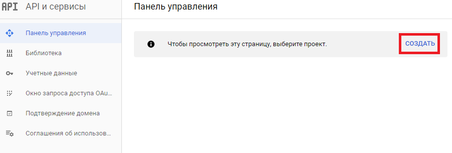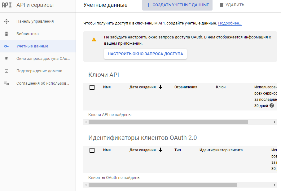 Для создания учетных данных нажмите соответствующую кнопку в консоли разработчика Google.