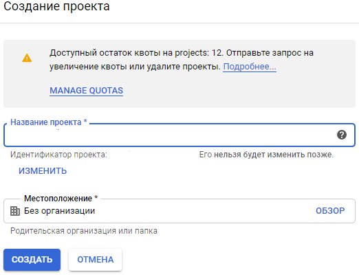 В открывшемся мастере создания проектов укажите идентификатор проекта, выберите местоположение и завершите процесс создания элемента с помощью кнопки «Создать».