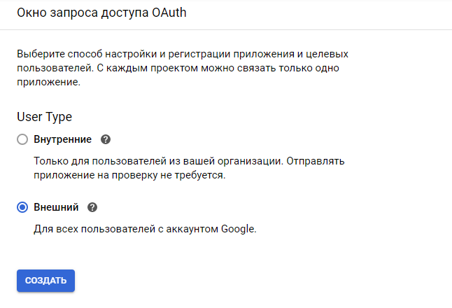 Мастер настройки учетных данных предложит вам способ настройки и регистрации приложения и целевых пользователей. Необходимо выбрать настройку User Type «Внешний» и нажать кнопку «Создать».