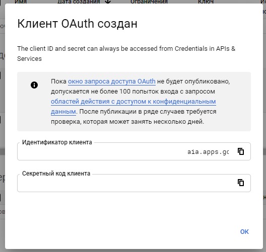 По факту заполнения всех полей нажмите кнопку «Создать». После создания будет отображено окно с информацией о идентификаторе OAuth клиента и его секретном коде. Скопируйте полученный идентификатор и приступите к настройке файла публикации информационной базы (default.vrd).