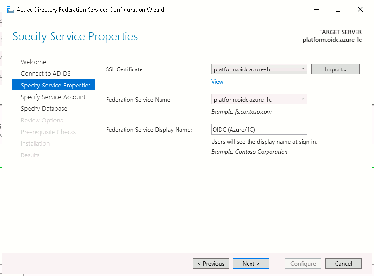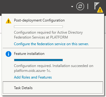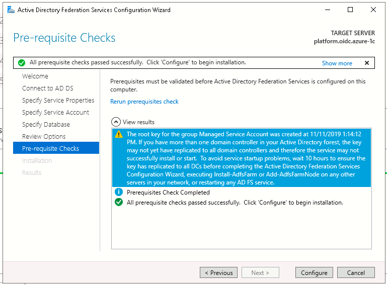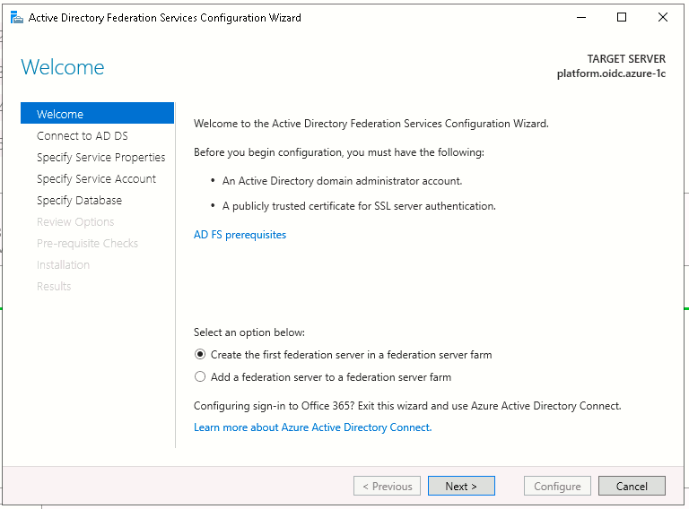 После установки компонентов в открывшемся окне предупреждения консоли сервера необходимо нажать на «Configure the federation service on this server».