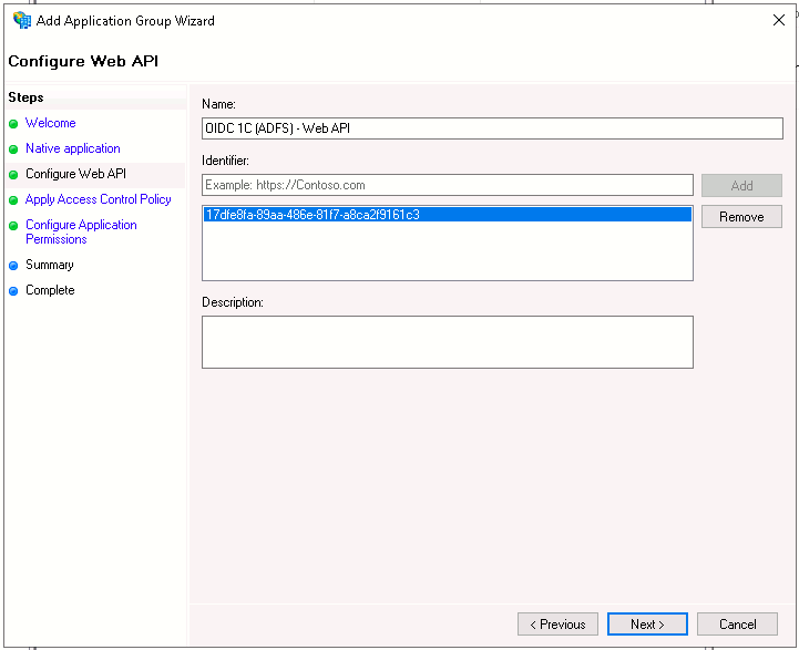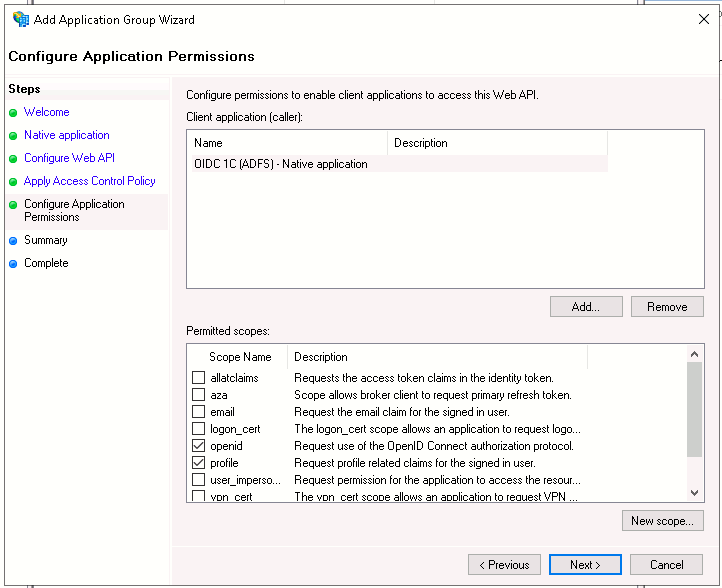 В окне свойств группы приложений в разделе «Applications» необходимо выбрать публикацию веб-интерфейса API группы приложений «OIDS 1C (ADFS)»