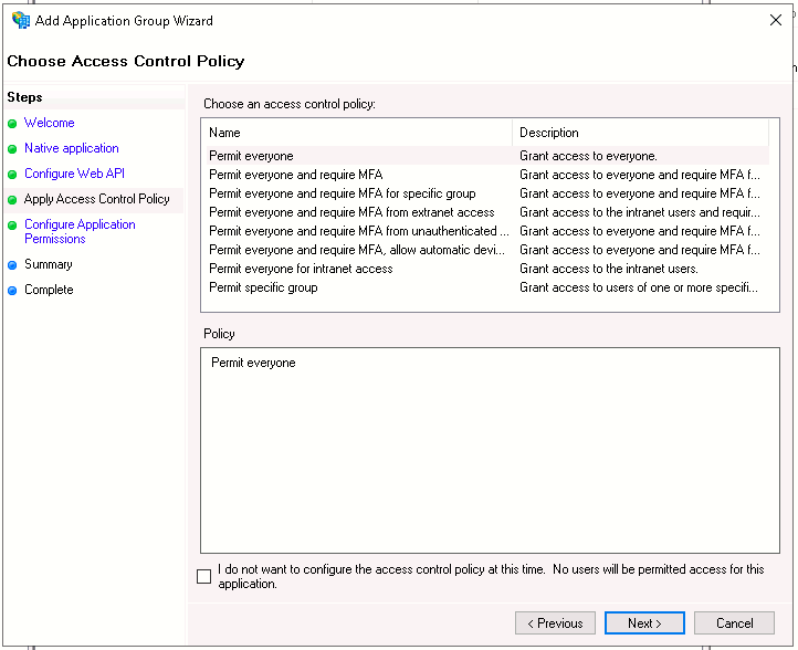 В окне свойств публикации веб-интерфейса API группы приложений необходимо перейти на вкладку «Политика контроля доступа» («Access control policy») и выбрать «Разрешение для каждого и запрос MFA», далее нажать «ОК».