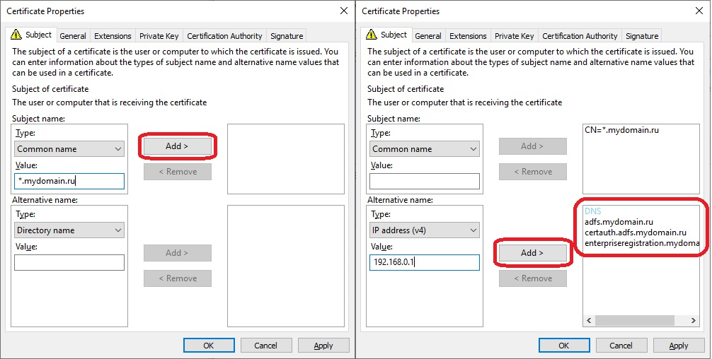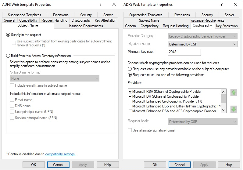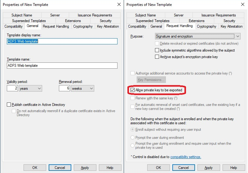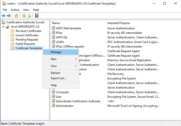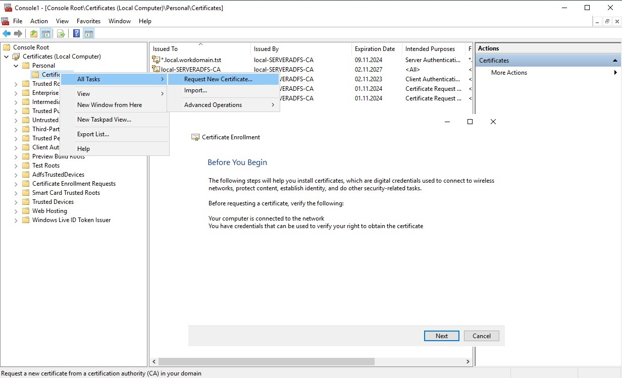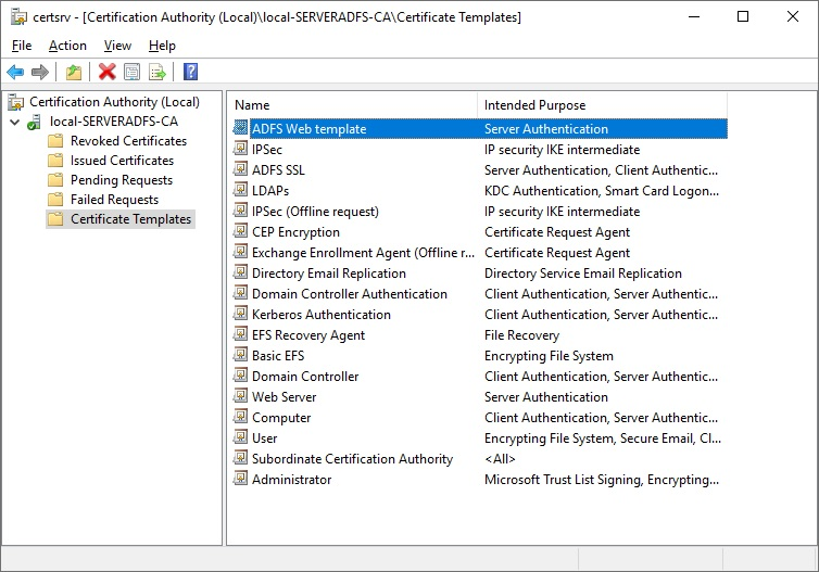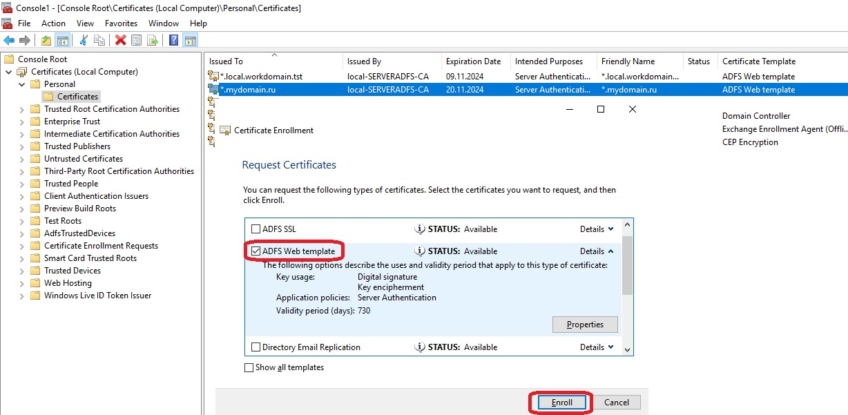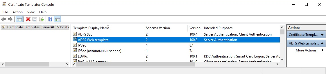 После создания шаблона сертификата можно перейти к созданию сертификата сервера, который будет использован при установке AD FS.