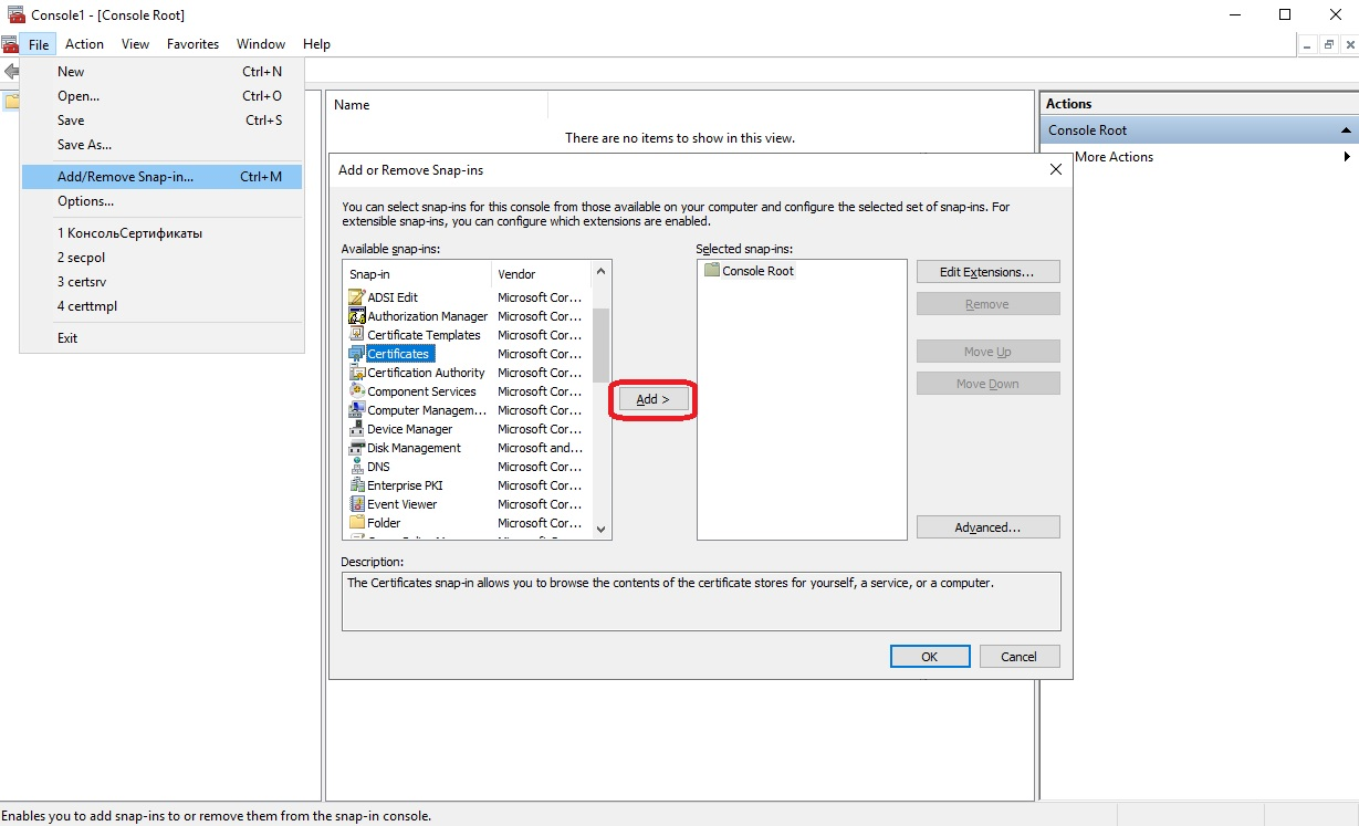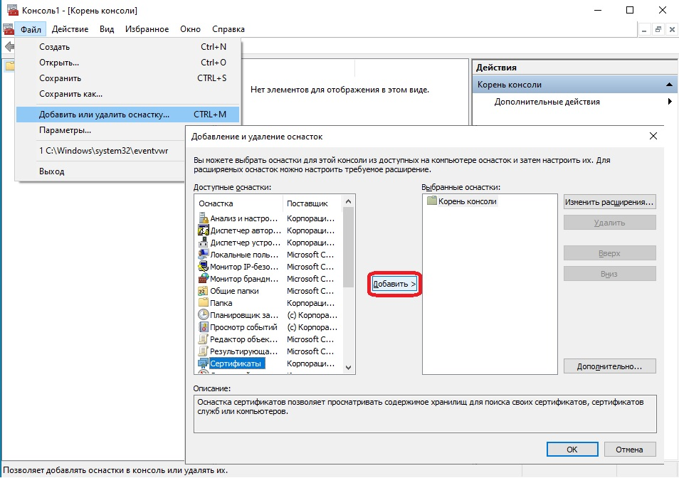 В левой части окна добавления оснастки нужно выбрать пункт «Сертификаты» и нажать кнопку «Добавить» («Certificates» - «Add»):