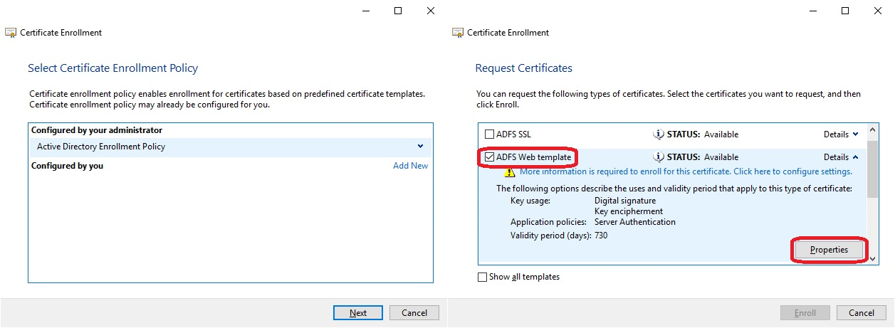 На следующем шаге откроется окно запроса сертификатов («Request Certificates»), в котором необходимо выбрать шаблон сертификата и нажать на кнопку «Свойства» («Properties»):