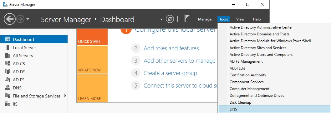 Для того, что его открыть необходимо в диспетчере сервера нажать на кнопку «Средства», далее «Центр сертификации» («Tools» - «Certification Authority»):