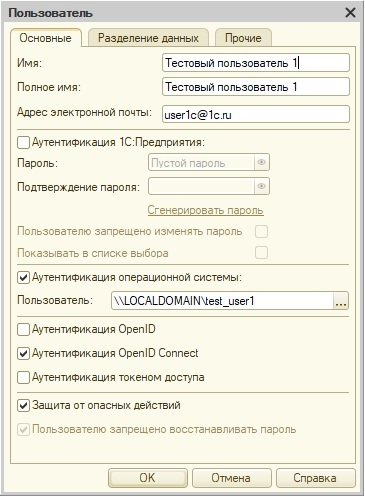 Далее в настройках пользователя 1С необходимо указать способ аутентификации: