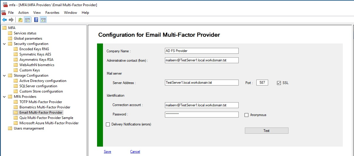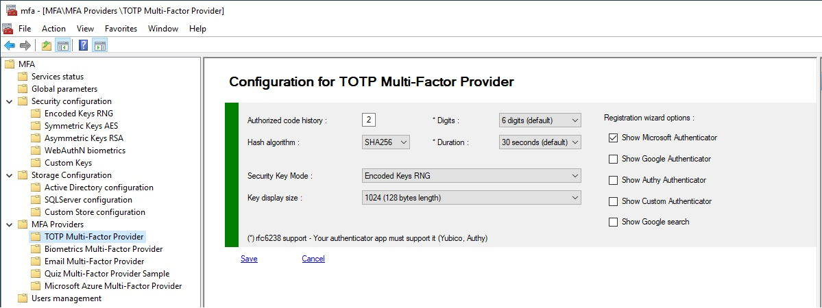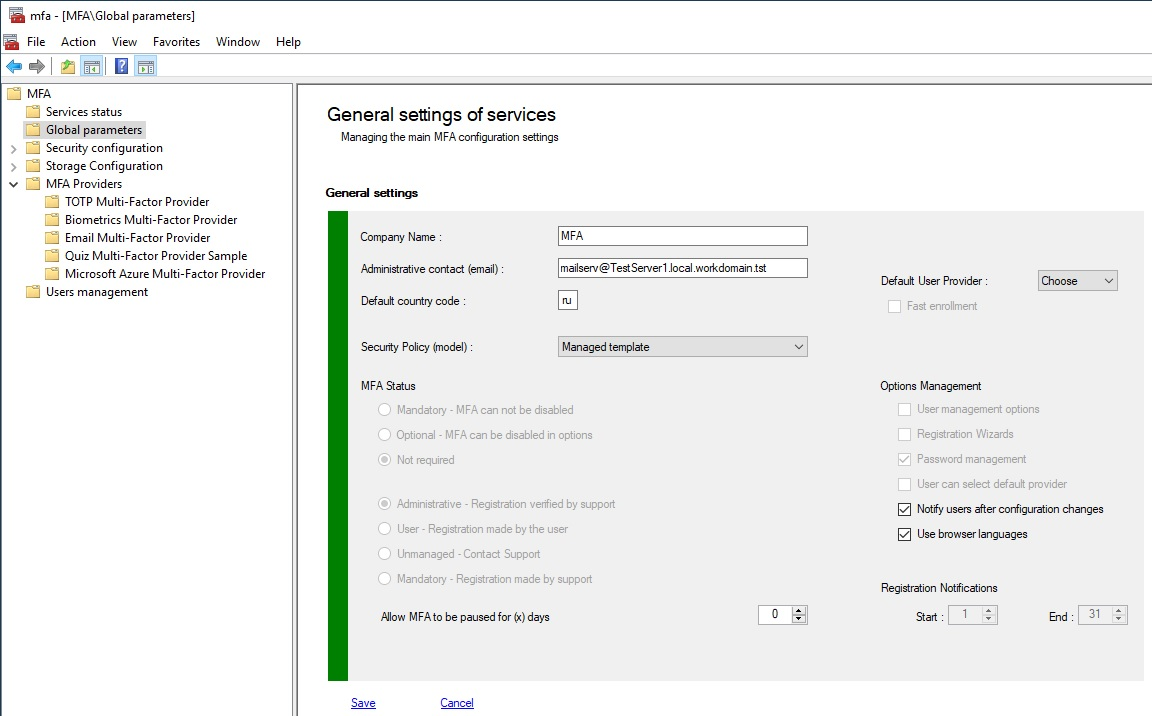 В оснастке MFA на вкладке «Global parameters» необходимо указать: