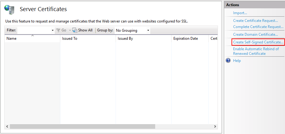 Откроется окно доступных сертификатов сервера (Server Certificates) в котором нужно нажать "Создать самозаверенный сертификат…" ("Create Self-Signed Certificate…").