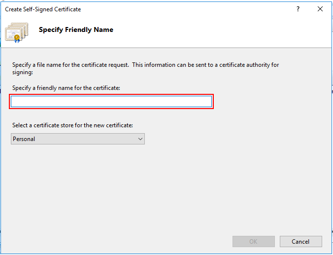 В окне мастера создания самоподписанного сертификата остается указать только произвольное название сертификата. В большинстве случаев, во избежание путаницы лучше явно указывать в качестве значения "Полное имя сертификата" ("Specify a friendly name for the certificate") адрес сервера, на котором расположен сервер IIS. Как только имя сертификата будет задано нажимайте на кнопку OK и переходите к пункту привязки сертификата.