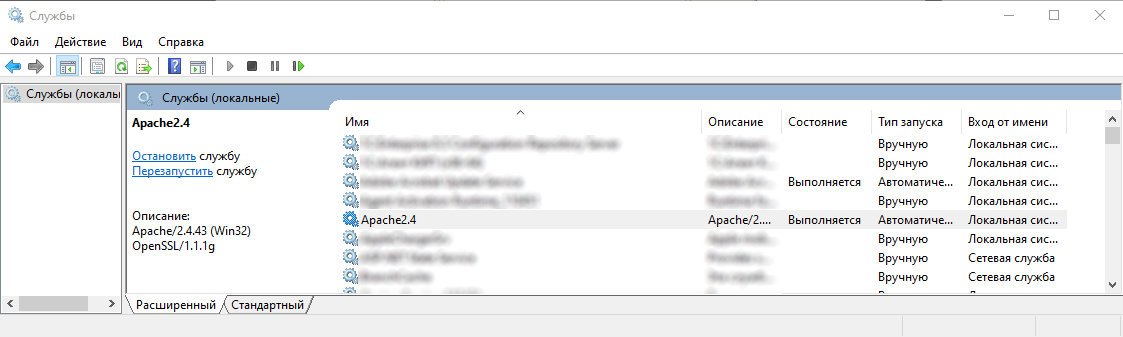 Это установит службу Apache, которой можно будет управлять в окне служб.
