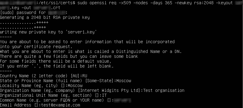 Во время выполнения команды будет задано несколько вопросов. Для "Common Name (e.g. server FQDN or Your bane)" нужно также указать имя сервера. Остальные поля заполняются произвольно (кроме "Country name" - здесь можно оставить по умолчанию).