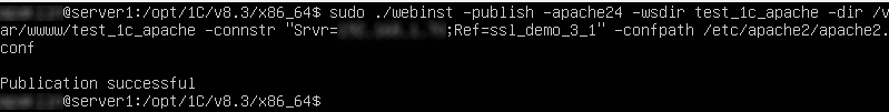 Копировать в буфер обменаsudo ./webinst -publish -apache24 -wsdir <ИМЯ ПУБЛИКАЦИИ> -dir /var/www/<ИМЯ ПУБЛИКАЦИИ> -connstr “Srvr=<ИМЯ СЕРВЕРА;Ref=<ИМЯ БАЗЫ>” -confpath /etc/apache2/apache2.conf
