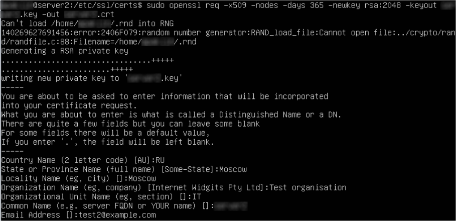 Во время выполнения команды будет задано несколько вопросов. Для "Common Name (e.g. server FQDN or Your bane)" нужно также указать имя сервера. Остальные поля заполняются произвольно (кроме "Country name" - здесь можно оставить по умолчанию).