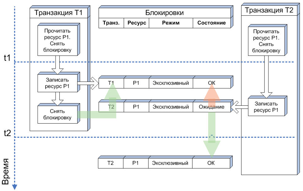 Схема возникновения взаимоблокировки такова. Две конкурирующие транзакции (Т1 и Т2) читают один и тот же ресурс – Р1. При этом устанавливаются разделяемые блокировки на этот ресурс. Разделяемые блокировки от конкурирующих транзакций могут существовать одновременно, поэтому к моменту времени t1 обе транзакции успешно установили свои блокировки и продолжают работу.