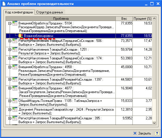 8. В форме анализа проблем производительности выбрать закладку "Код конфигурации", раскрыть первую вершину дерева и двойным щелчком открыть форму анализа взаимоблокировок: