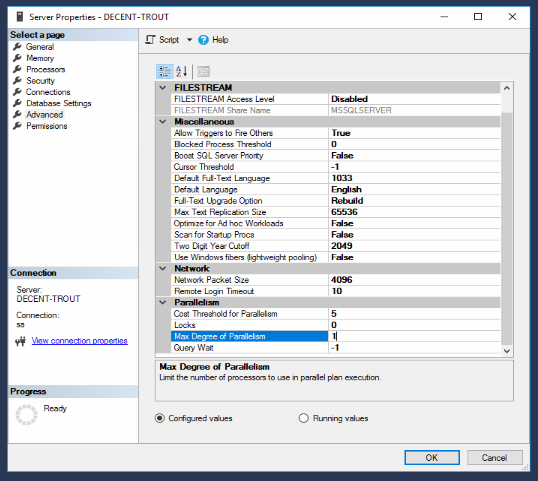 Рис. 1. Параметры SQL server
