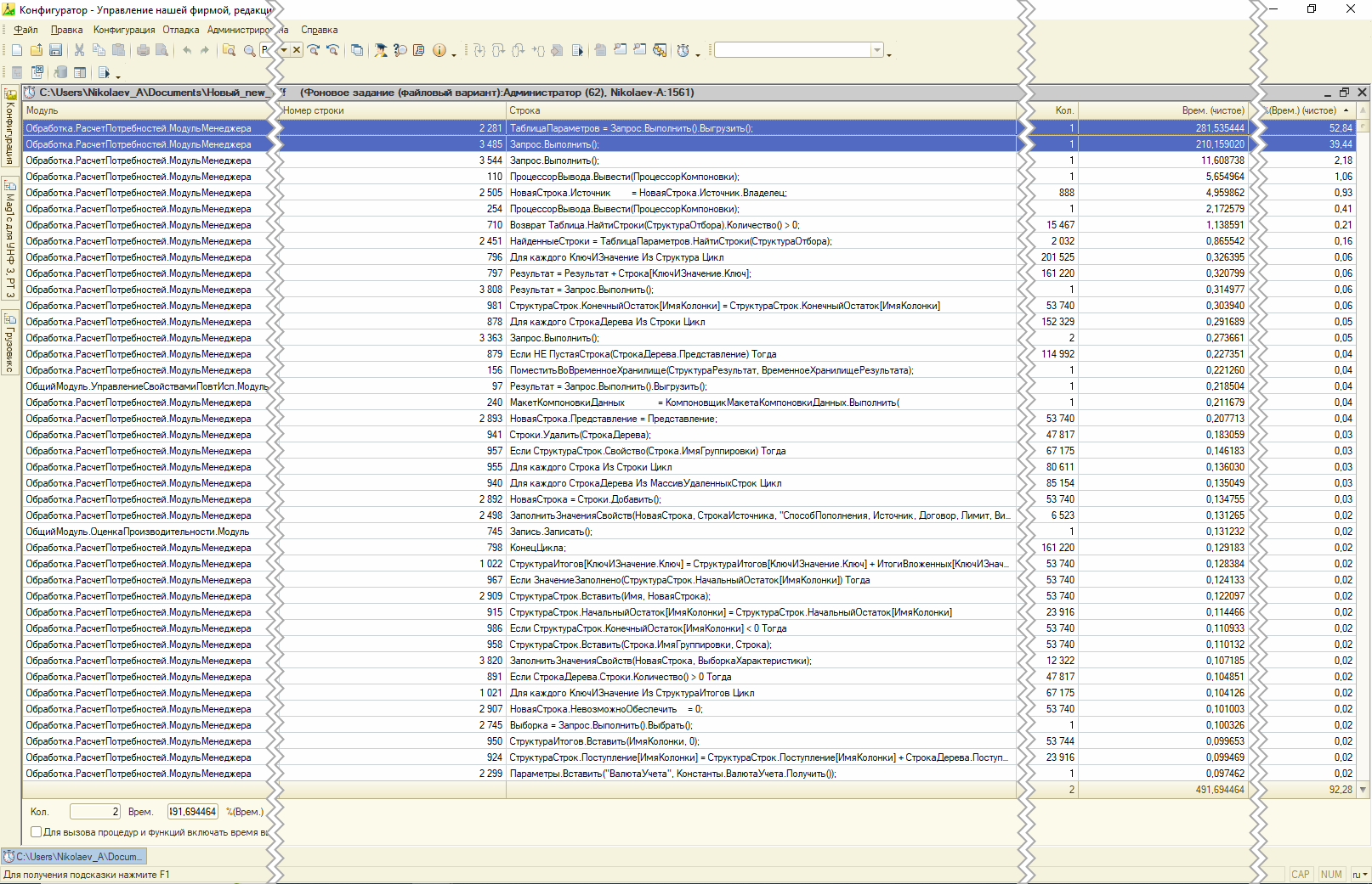 Используем такой же подход, что и при оптимизации запросов в базе SQL. Разбили пакетный запрос на части, и замерили каждый запрос, как было описано выше. Замер производительности показал проблемы чтения данных по номенклатуре поставщика (см. рис. 11)