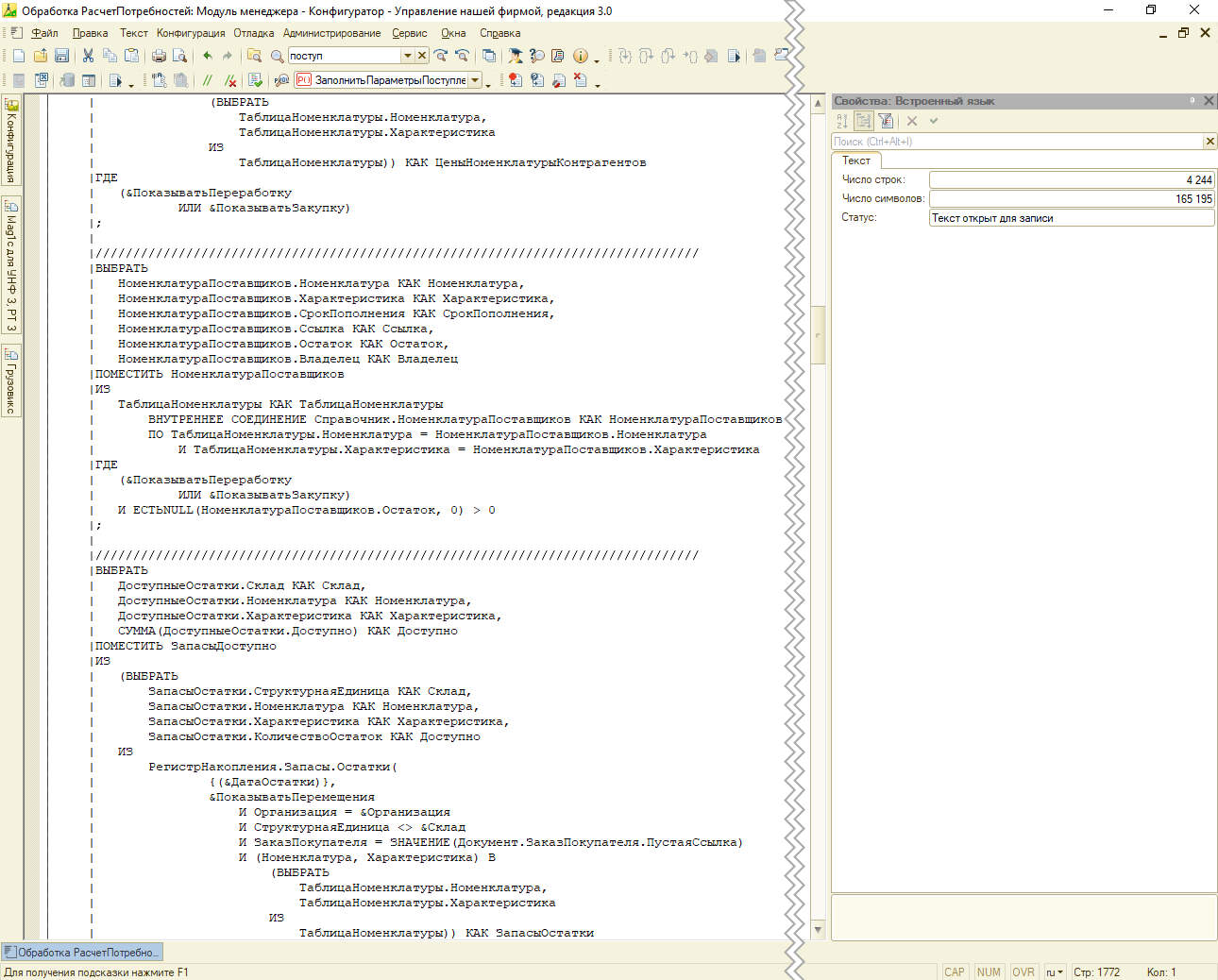 К нам обратился клиент с жалобой на скорость расчета потребностей. Клиент торгует запчастями, количество позиций порядка 20 тыс. Расчет потребности считает на несколько месяцев для примерно 1-1,5 тыс. позиций.