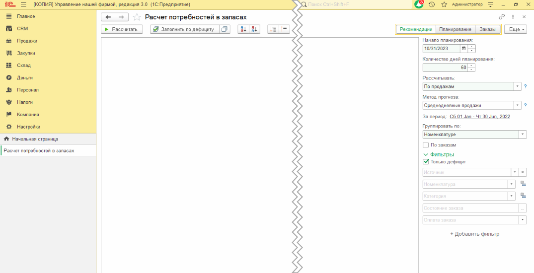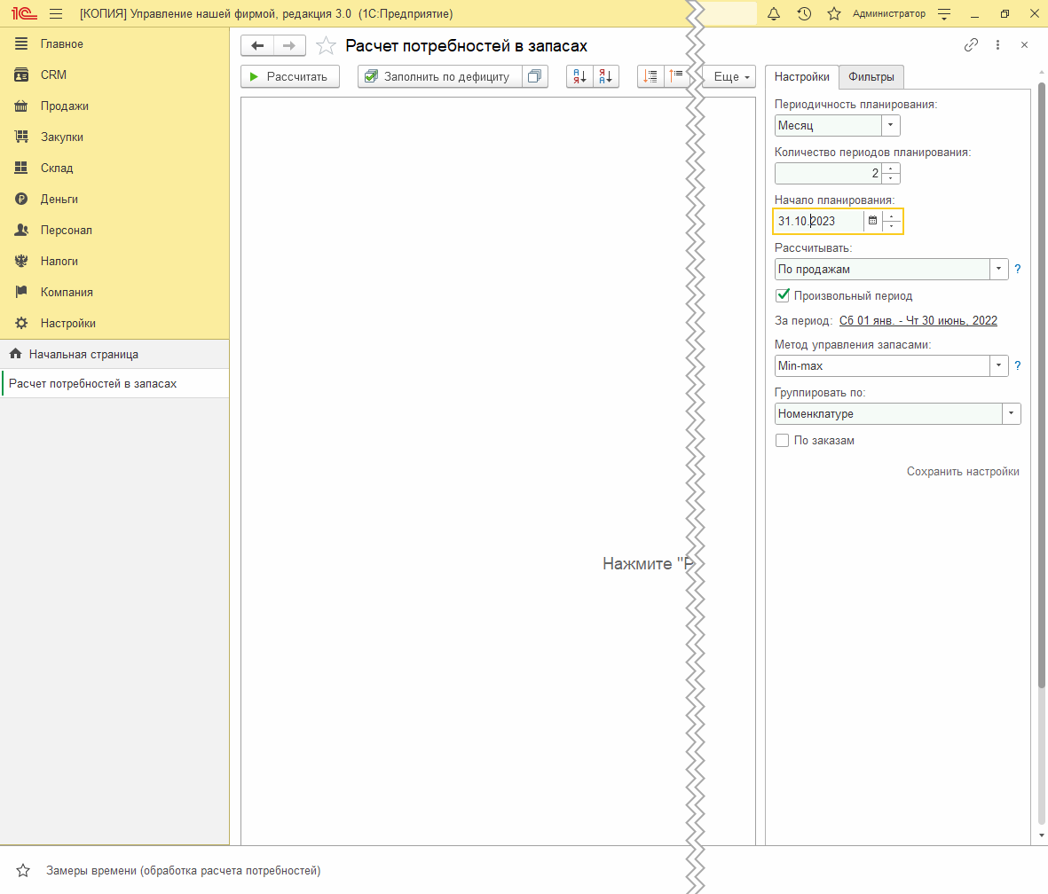 Итак, все готово для замеров производительности. Запускаем расчет потребностей, расчет строим по продажам за полгода, потребность формируем на два месяца вперед.