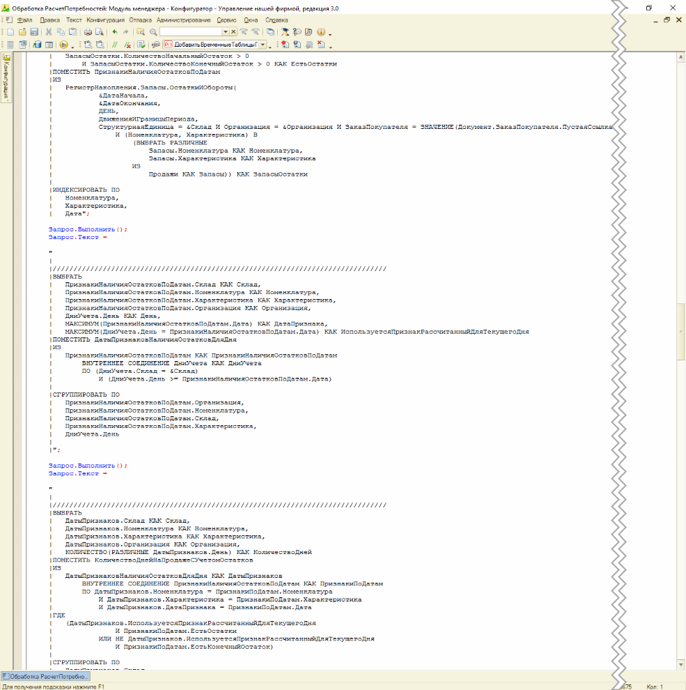 Запрос на получение продаж с учетом остатков выполняется в пакетном запросе, поэтому для удобства мы разбили его на несколько выполнений запросов, чтобы в отладчике определить какой запрос дольше всего выполняется (картинка кода) и дальше отловить проблемный запрос в трассировке (см. рис. 4).