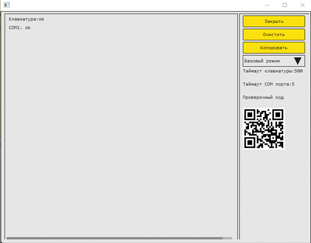 Окно тест делает попытку подключения всего доступного оборудования с заданными в форме настроек параметрами. После чего можно сканировать различные ШК, данные полученные с них будут отображаться в поле данных. Получаемая от оборудования информация может быть представлена в окне "Тест" в 3-х режимах: "Тестовом", "Рабочем" и "Отладка клавиатуры". "Тестовый" режим показывает данные от оборудования с заменой непечатаемых символов на их названия, а также названия специальных клавиш, если данные получены от клавиатуры.