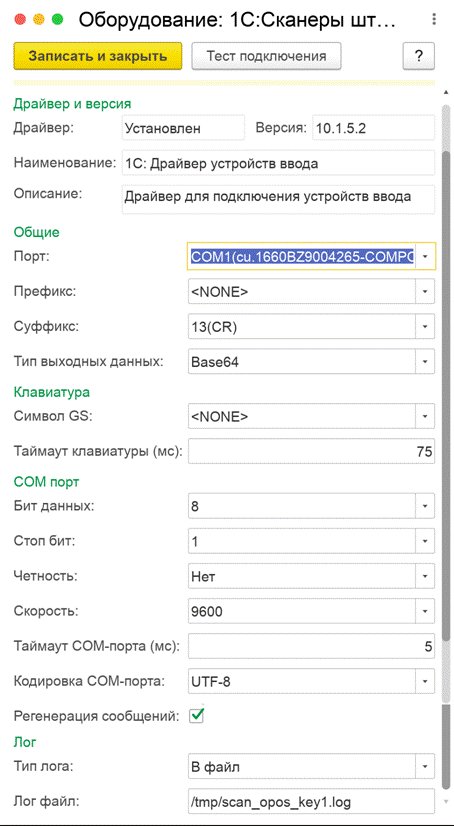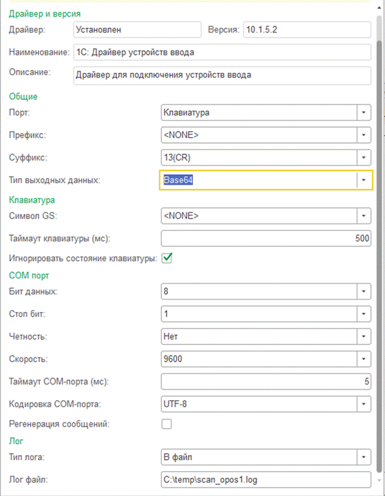 | BarcodeBase64 | В случае английской локали "1С: Предприятие", Типа оборудования "Сканер" и "Типа выходных данных" Base64 |