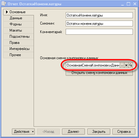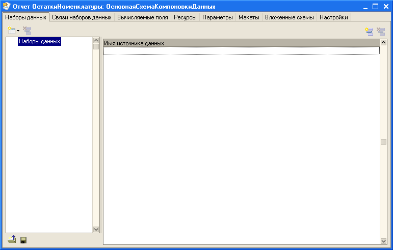 В появившейся форме введем в поле ввода "Имя" имя отчета: "ОстаткиНоменклатуры". После этого перейдем к созданию схемы компоновки данных.