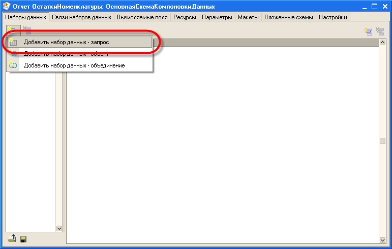 Первым шагом при создании новой схемы компоновки данных является добавление набора данных, из которого будут получены данные. В нашем случае данные будут получены при помощи запроса, поэтому добавим набор данных - запрос.