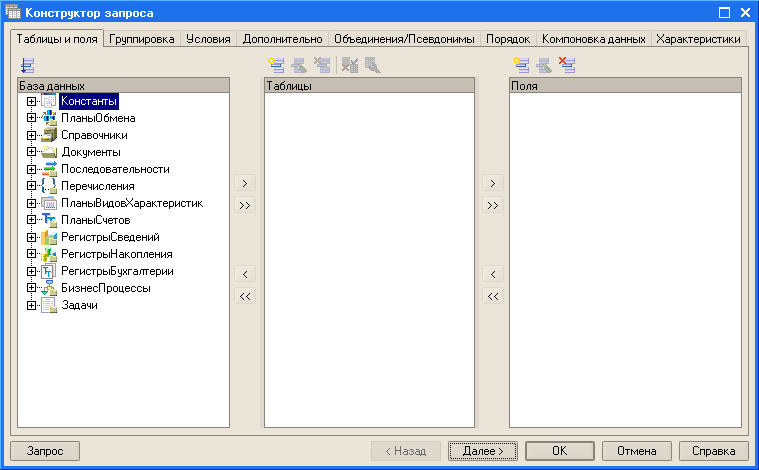 Конструктор запроса позволяет создавать и редактировать запросы любой сложности и является весьма мощным инструментом. Форма конструктора запроса выглядит следующим образом:
