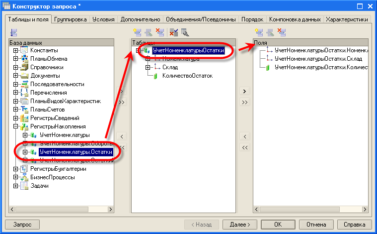 Найдем в дереве базы данных, в ветке "РегистрыНакопления", таблицу "УчетНоменклатуры.Остатки" (имя "Остатки" после точки в данном случае указывает, что мы будем обращаться к виртуальной таблице остатков, которая и предоставит нам остатки в разрезе каждой номенклатуры на каждом складе). Двойной щелчок на таблице приведет к тому, что таблица будет помещена в табличное поле "Таблицы". В этом поле отображаются все таблицы, из которых будут получаться данные запроса.