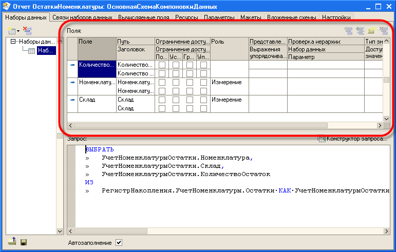 Обратим внимание на список полей, который система 1С:Предприятие 8 заполнила в верхней части конструктора запроса. В нем отображаются поля, которые доступны у текущего набора данных. В нашем случае система 1С:Предприятие заполнила данный список автоматически, из текста запроса, и нет необходимости в его настройке вручную.
