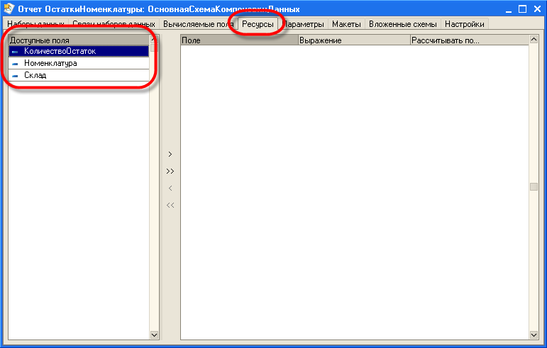 Для указания ресурсов перейдем на закладку "Ресурсы". На этой закладке в левой части мы видим список полей, которые допускается использовать в качестве ресурсов. В правой части расположено табличное поле, содержащее выражения для расчета ресурсов.