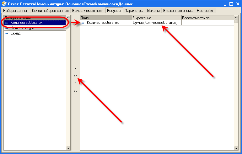 Нам необходимо рассчитать суммы по полю "КоличествоОстаток".