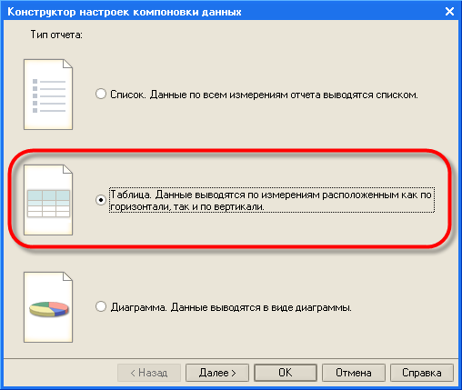 Конструктор настроек компоновки данных позволяет шаг за шагом создать типовые настройки отчета.