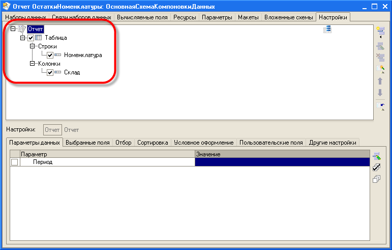 Созданные конструктором настройки система 1С:Предприятие 8 помещает в настройки схемы компоновки данных. Если в дальнейшем нам понадобится их изменить, мы сможем доработать их произвольным образом при помощи табличных полей или же снова воспользоваться конструктором.